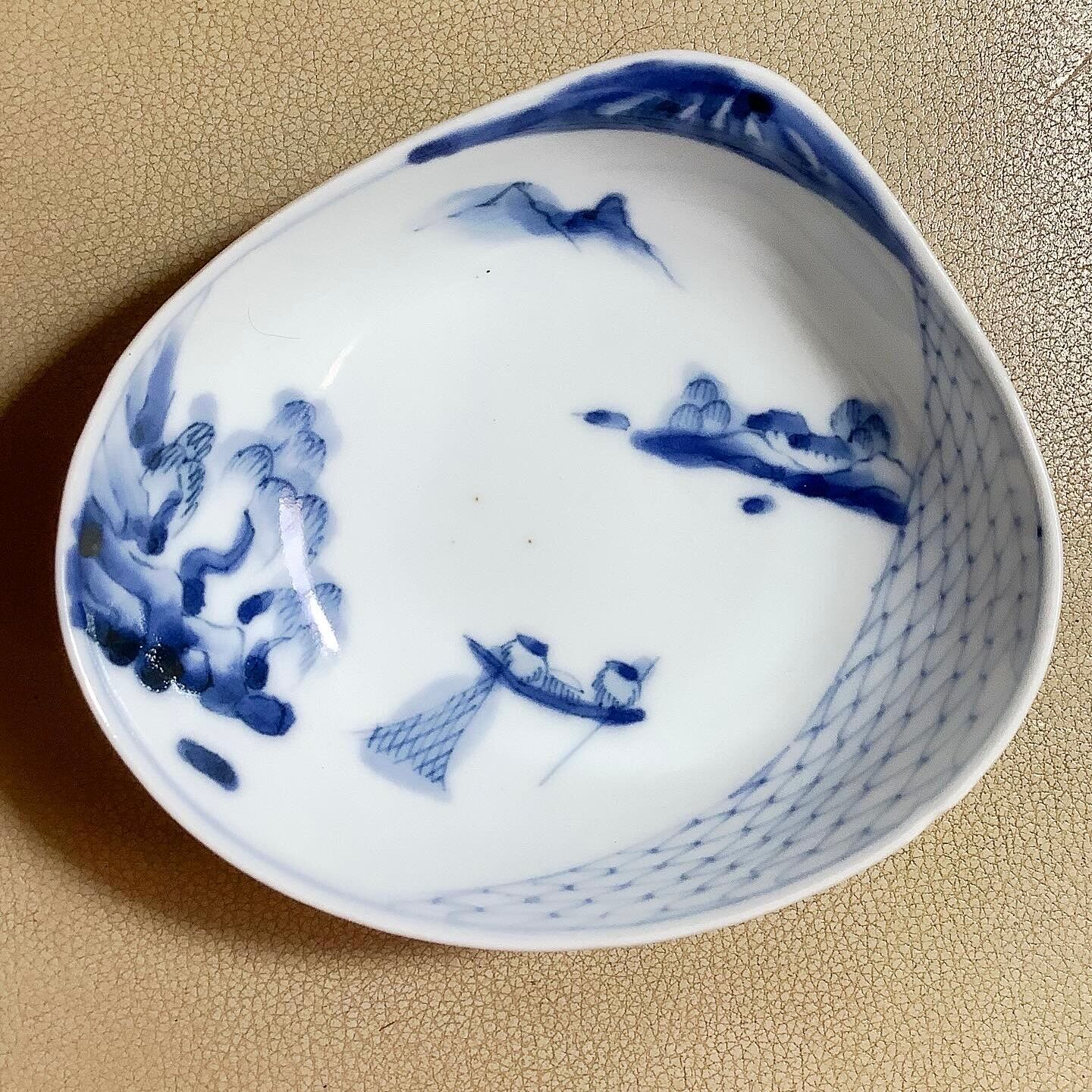 貝の形の中に海で漁をしている風景や山、網、表には波が手書きで描かれています。